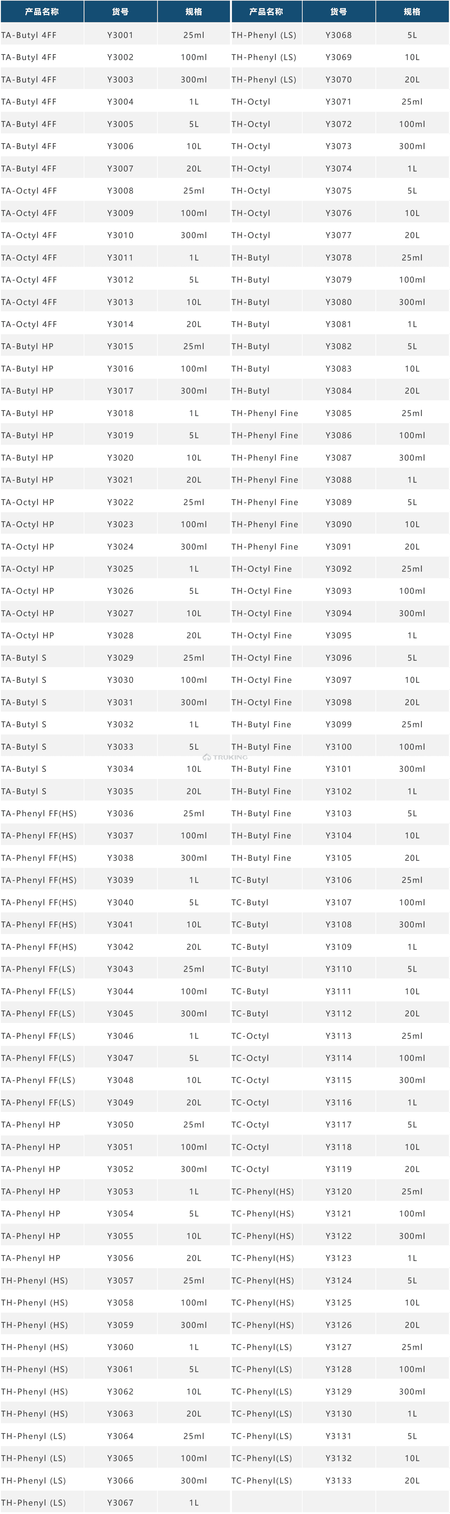 Ø TH(Truking Hard)高刚性琼脂糖基架,可耐受超过5bar的压力。是通过对传统的TA(Truking Agarose) 6FF琼脂糖基架进行化学改构和修饰而成的,具有更好的机械性能。TH(Truking Hard)-HIC是将疏水作用基团偶联到带有葡聚糖长链的高刚性琼脂糖上,与TA(Truking Agarose) -HIC FF相比虽有相接近的粒径大小,但具有流速快、反压低、载量高等特点。